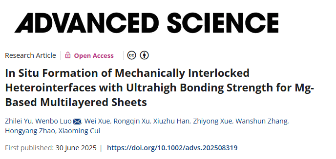 近日,先进材料研究院薛志勇教授团队在异质界面层状材料设计和调控研究中取得重要突破,相关研究“In Situ Formation of Mechanically Interlocked Heterointerfaces with Ultrahigh Bonding Strength for Mg-Based Multilayered Sheets”于2025年6月30日在线发表在国际顶尖期刊《Advanced Science》上。草榴 博士研究生于智磊为第一作者,罗文博老师为通讯作者。