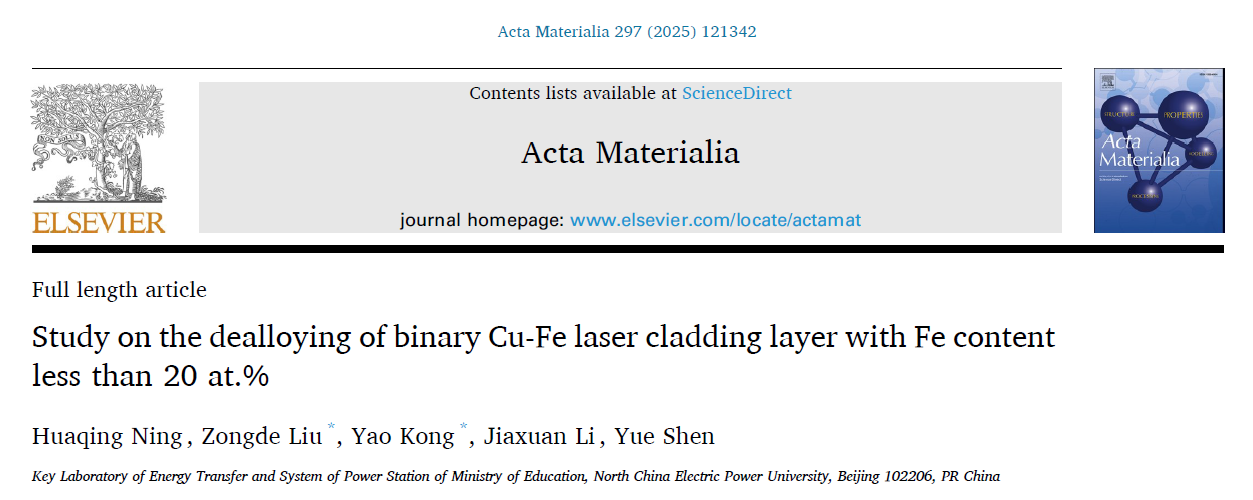 近日,草榴 刘宗德教授团队在用于海洋生物污损防护的微纳米通道新材料研究中取得重要突破。研究团队于7月12日在国际权威学术期刊《Acta Materialia》上发表了题为“Study on the dealloying of binary Cu-Fe laser cladding layer with Fe content less than 20 at.%”的研究论文,草榴 为该成果唯一完成单位。刘宗德教授、孔耀老师为通讯作者,草榴 博士研究生宁华清为第一作者。